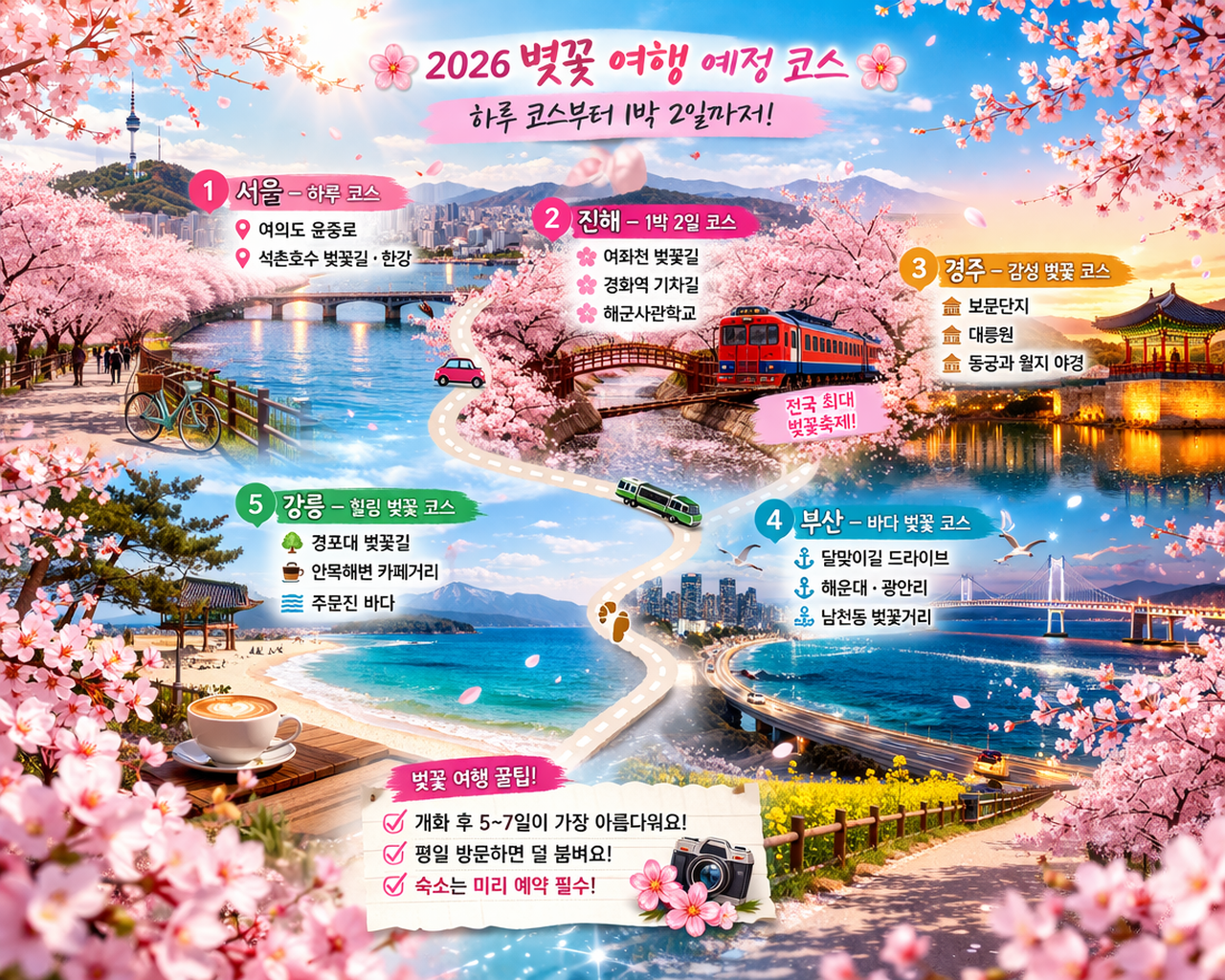이번 글에서는 2026년 벚꽃 시즌을 맞아 꼭 가봐야 할 여행 코스를 하루 일정부터 1박 2일 코스까지 자세히 소개해드리겠습니다.
